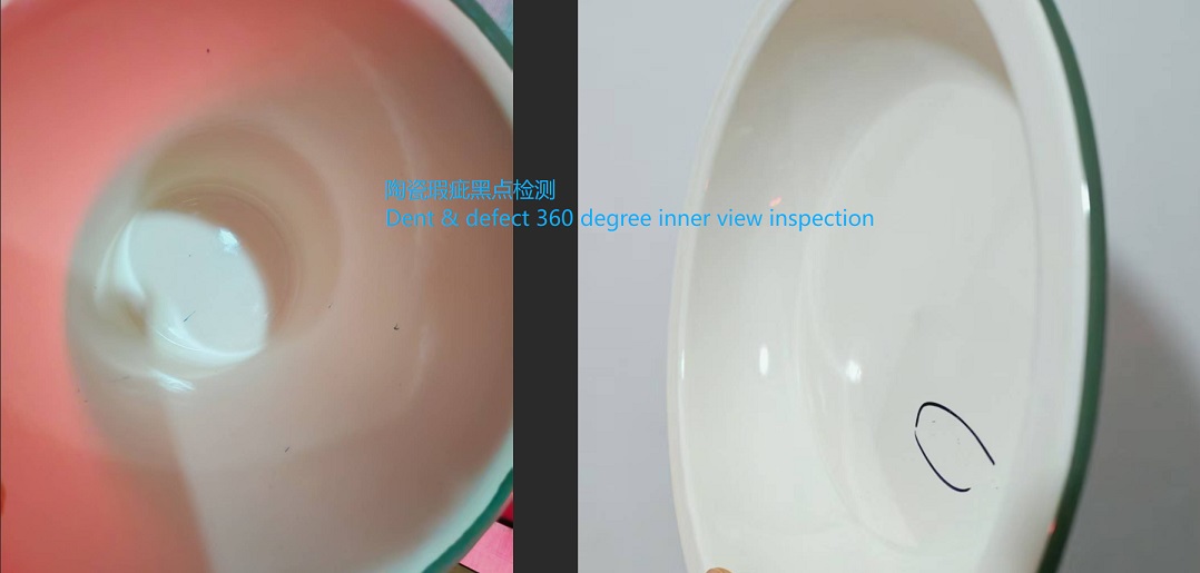 Ceramic mug defect and dent 360 degree inner view lens inspection innovation for an old vision inspection application, to save much more cost of multi-cameras and large size module, to make vision inspection more easy, simple, lower cost and important is : milestone innovation making technology going forward. 360度内壁瑕疵黑点等检测,让视觉检测技术更新迭代,小型化,低成本化,智能化,低售后化是未来视觉检测的发展之路。技术更新,才是王道。内外壁检测。